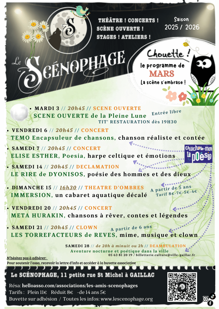 Lieu de création, de diffusion et de promotion des arts de la scène, inscrit dans une dynamique locale, le Scénophage vous présente sa programmation mensuelle. Venez nombreux !