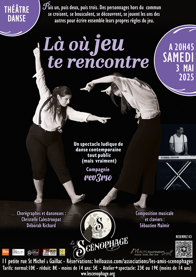 Spectacle à la fois ludique et pédagogique sous forme de danse contemporaine mêlant danse, théâtre de geste et musique . « Là où jeu te rencontre » est créé et porté au plateau par 3 interprètes / pédagogues : 2 danseuses et 1 musicien de la compagnie Rev3rso