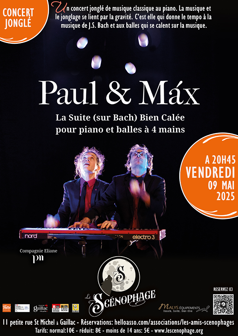 Paul & Máx jouent la Suite (sur Bach) Bien Calée pour piano et balles à 4 mains. Un concert jonglé de musique classique au piano. La musique et le jonglage se lient par la gravité. C’est elle qui donne le tempo à la musique de J.S. Bach et aux balles qui se calent, inéluctablement, sur la musique.
