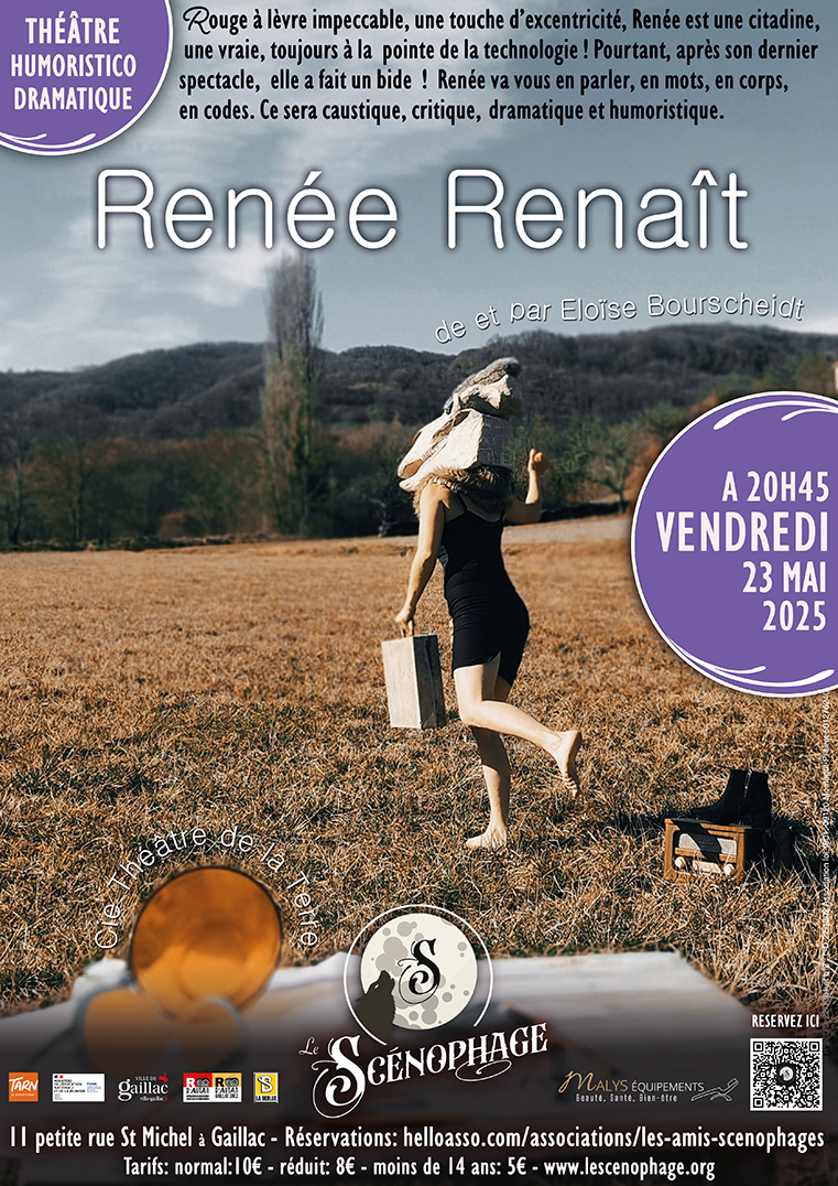 Un rouge à lèvre impeccable, une touche d’excentricité, Renée est une citadine, une vraie, toujours à la pointe de la technologie ! Pourtant, après son dernier spectacle, elle a dû Mais ça vous le saviez déjà non ?!_« Et c’est pour ça que vous êtes là … Pour voir celle qui a fait un bide … »_Et bien puisque vous êtes là, Renée va vous parler,en mots, en corps, en codes.