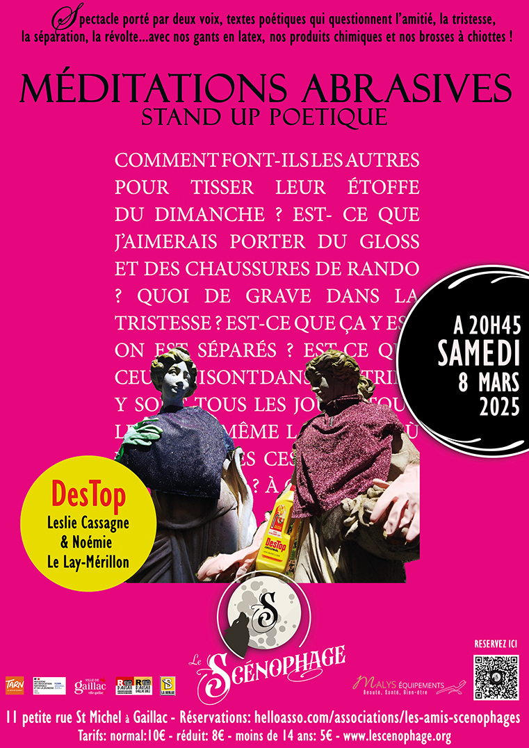 Les MÉDITATIONS ABRASIVES est un spectacle porté par deux voix, par un être à deux têtes. Nous y explorons la dimension sonore de textes poétiques qui questionnent l’amitié, la tristesse, la séparation, la révolte, le besoin de prendre un peu de hauteur… C’est aussi un regard sur toutes les versions de nous avec lesquelles on joue, à la rencontre de personnages-totem issus de nos rêveries et de nos souvenirs. S’unissent alors deux attitudes face au monde : un questionnement existentiel et un décapage cynique du réel, nos expériences ressaisies avec nos gants en latex, nos produits chimiques et nos brosses à chiottes !