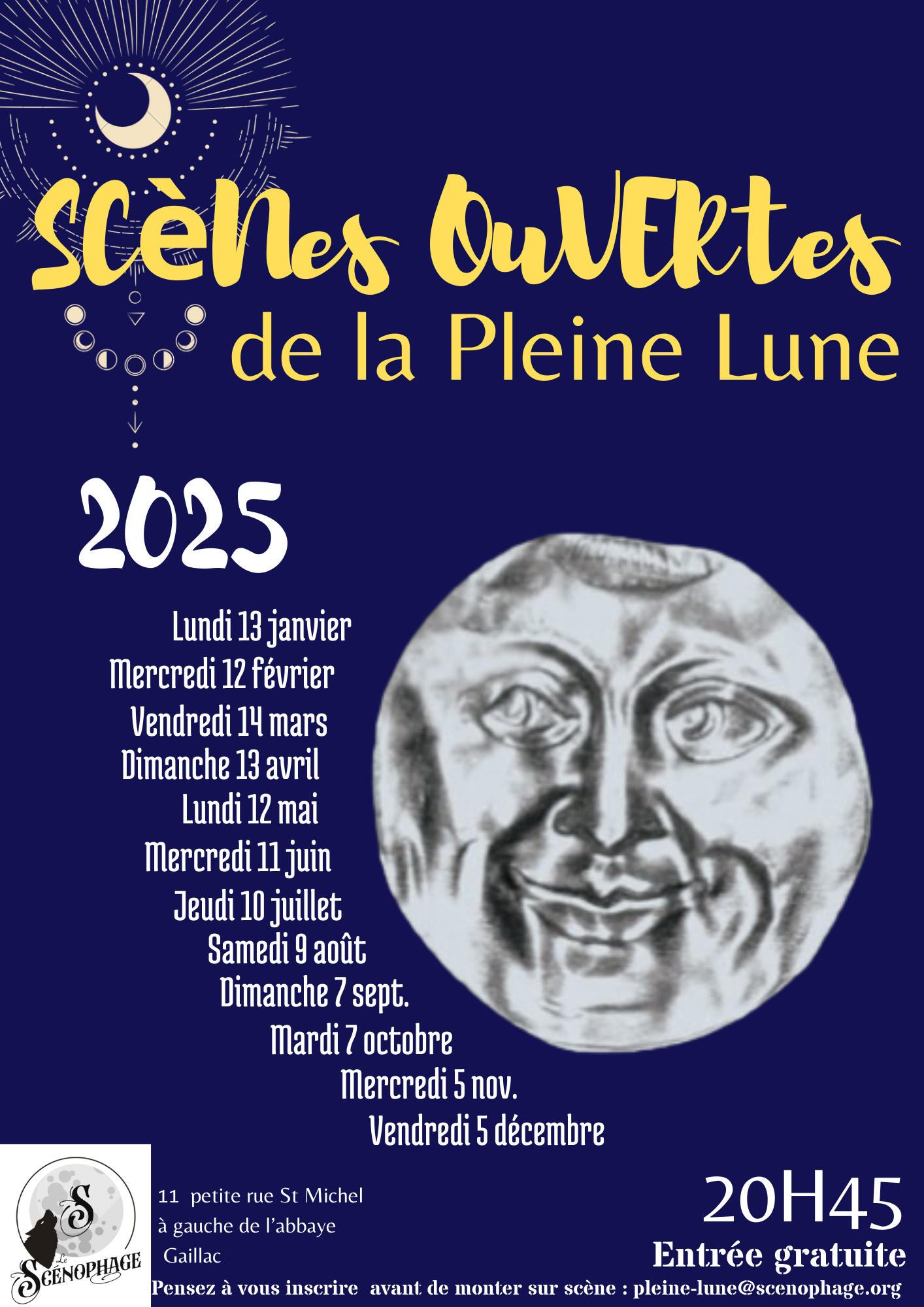 Comme à chaque Pleine Lune, la scène du Scénophage est à vous. Venez essayer vos compos, textes, et autres interprétations. Pour préparer votre passage au mieux : RESERVEZ VOTRE PLACE SUR SCENE au moins 15 jours à l’avance par email pleine-lune@scenophage.org. Ensuite pour les artistes, rendez-vous à 20h pour organisation régie, musique, 3/4 morceaux (15min max), autres (10/15min). Un verre offert à chaque artiste !