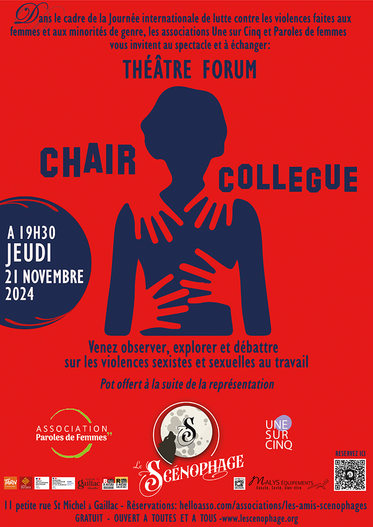 Les associations Une sur Cinq et Paroles de femmes ont le plaisir de vous convier à la représentation du spectacle « Chair collègue », dans le cadre des manifestations autour du 25 novembre, journée internationale de lutte contre les violences faites aux femmes et aux minorités de genre.