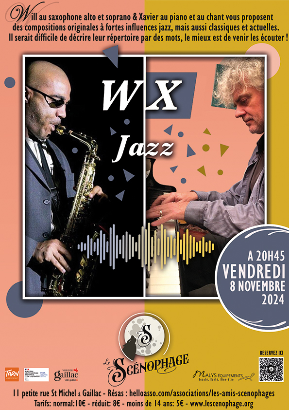 WXJazz est la réunion de deux musiciens Will et Xavier. Le répertoire de ce duo piano saxophone comprend exclusivement des compositions à forte influence jazz mais aussi classique et actuelle. Will au saxophone alto et soprano, peut aussi prendre la basse ou la flûte. Il a parcouru le monde dans différentes formations et styles. Xavier au piano et occasionnellement au chant a lui aussi nourri une passion pour le jazz, la musique classique ou le pop/rock avec une préférence pour la composition ( jazz, spectacles, opéras pour enfants, chansons…).