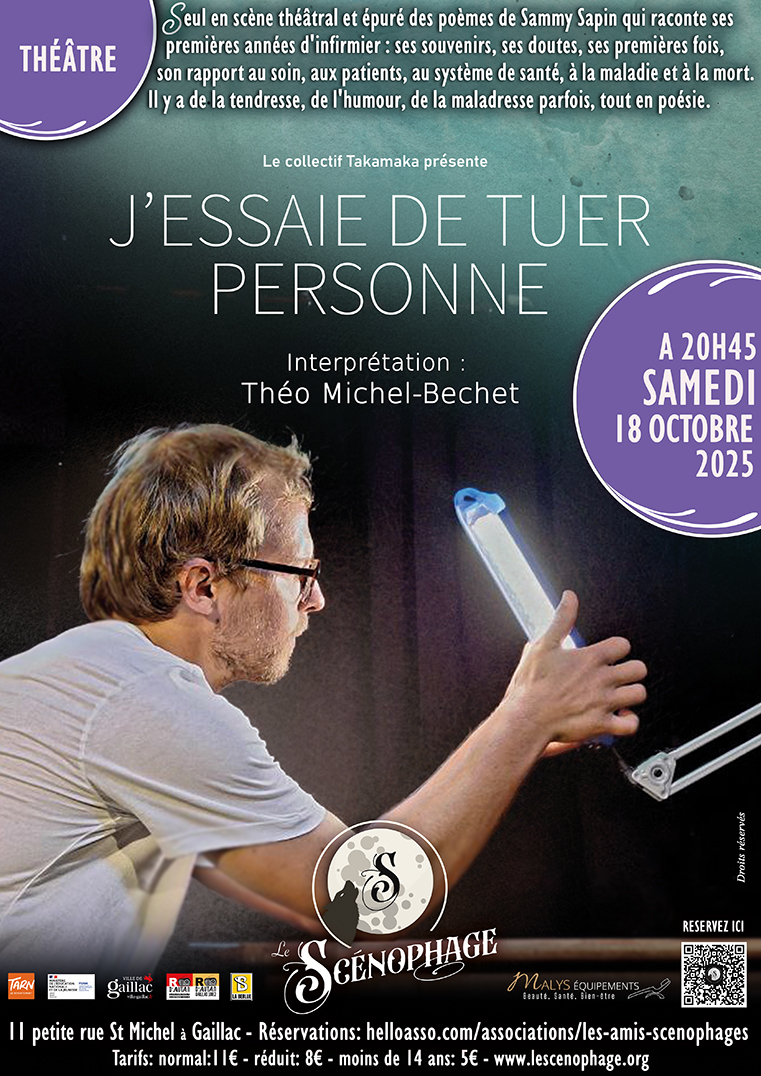 “J’essaie de tuer personne” c’est l’adaptation au théâtre des poèmes de Sammy Sapin. Dans ce seul en scène, le comédien incarne l’infirmier qui entre lui-même dans la peau de ses patients et parfois de ses collègues. Il revit les scènes marquantes de son apprentissage et nous emmène dans son imaginaire. A travers une mise en scène épurée, nous voyageons dans les souvenirs de cet infirmier qui raconte ses doutes, ses premières fois, son rapport au soin, aux patients, au système de santé, à la maladie et à la mort. Il y a de la tendresse, de l’humour, de la maladresse parfois, tout en poésie.