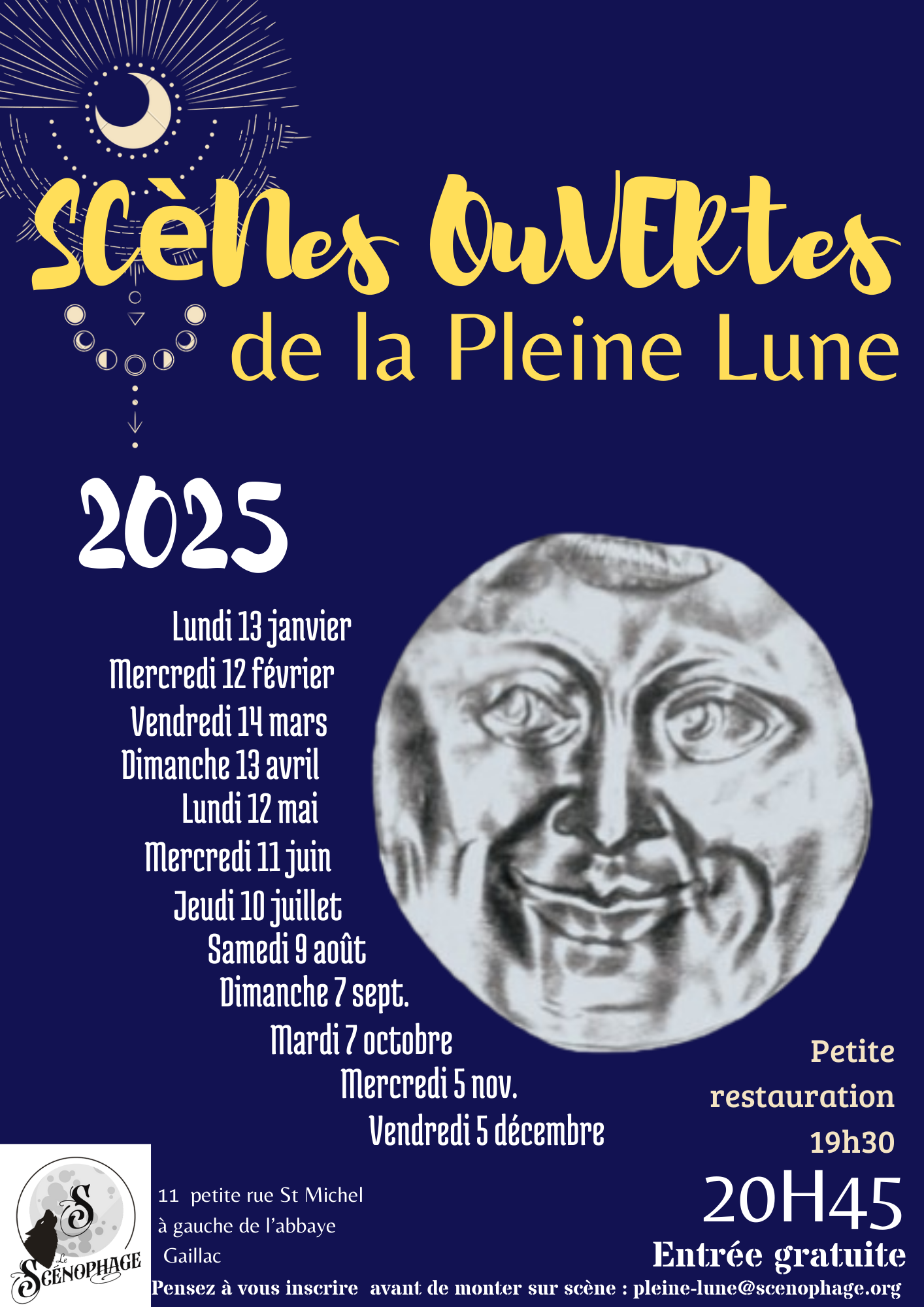 C’est une surprise à chaque fois : Chaque nuit de la pleine lune, qu’il pleuve qu’il vente, qu’il neige ou qu’il canicule, les artistes, en herbe ou confirmés, amateurs ou professionnels viendront vous proposer leurs dernières créations, leurs envies d’un instant : une blague, un tour de magie, une lecture, un court métrage, une chanson, un tableau, un vêtement, un poème, un extrait de spectacle, une sculpture.