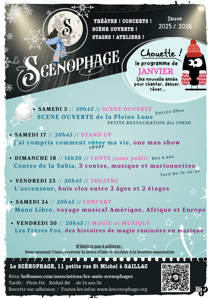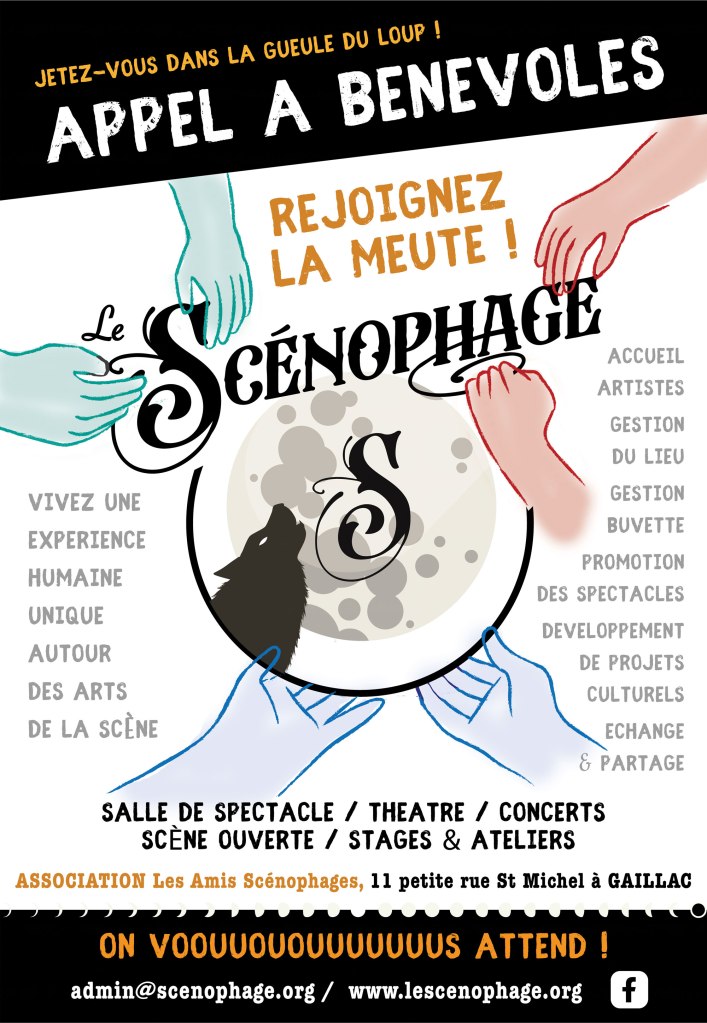 Lieu de création, de diffusion et de promotion des arts de la scène, inscrit dans une dynamique locale, le Scénophage vous présente sa programmation mensuelle. Venez nombreux !